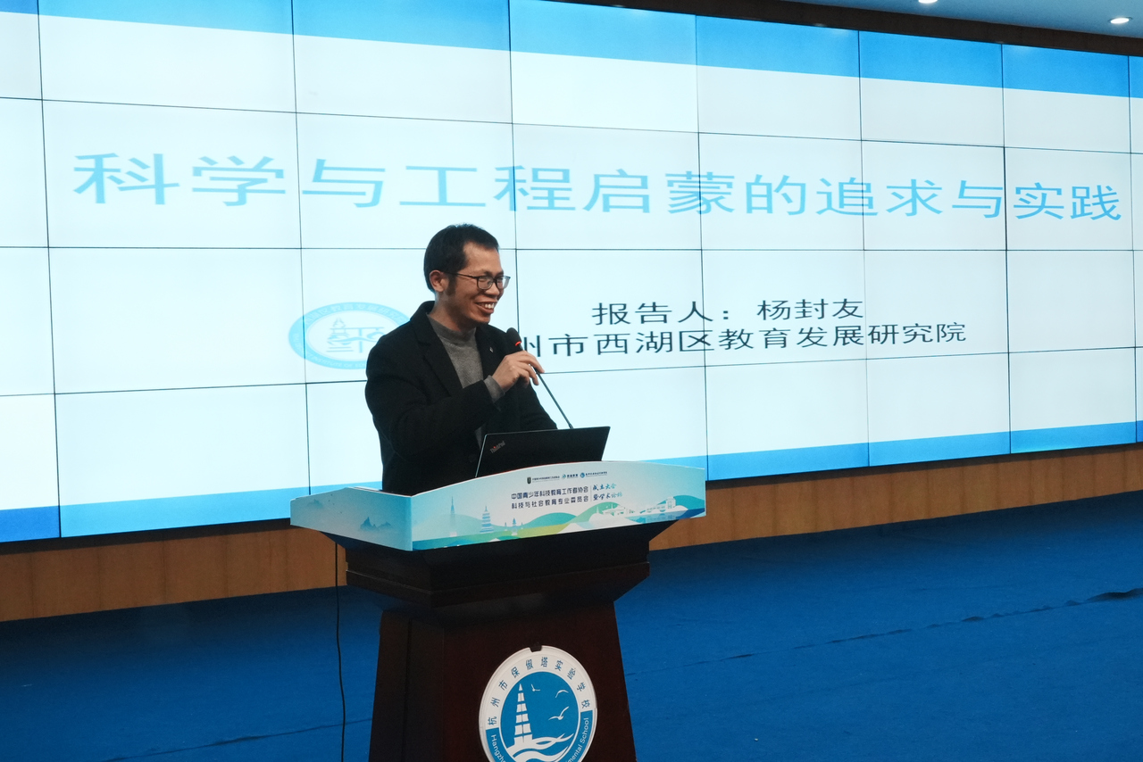 西湖区教育发展研究院副院长杨封友作《科学与工程启蒙的追求与实践》主题报告。报告紧扣国家科技教育要求,提出义务教育阶段要夯实科创基础,融入“关怀创造、和谐共生”理念。他介绍了区域STEM教育框架,分享国家级跨学科项目成果与AI融合课例,强调以关怀激发创造,让科创教育扎根常态课堂,夯实创新人才培养根基。