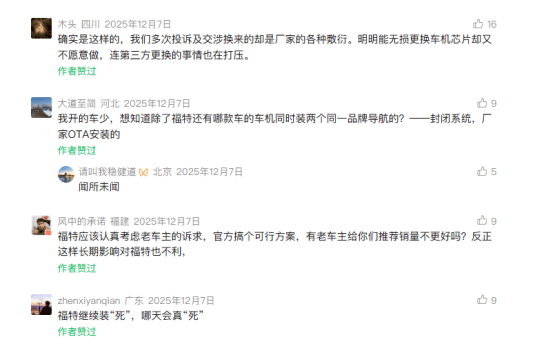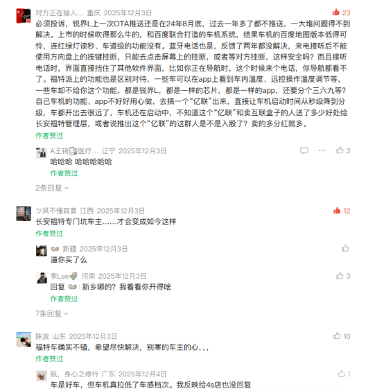 (长安福特车机问题相关报道评论区截图)