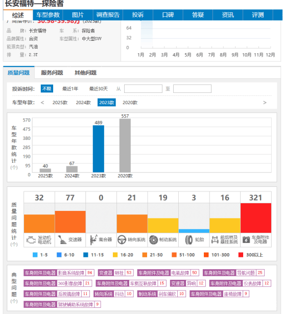 2026年2月,锐界L车主的维权仍无进展——92%受访车主表示未收到实质回应,20%升级“体验版百度地图”的车主反馈“车机更卡顿”,北京车主李先生甚至遇到“一个车机装两个旧版地图”的荒诞情况。长安福特锐界L车主集体维权后续:厂家仅推体验版百度地图导致车机更加卡顿,核心功能仍遥遥无期如今,这一问题进一步扩散至旗舰SUV车型探险者,车质网数据显示,2023款探险者489件质量投诉中,车身附件及电器类问题占比超40%,其中车机系统类故障达177件,占比36.2%,成为该车型最核心的投诉痛点。