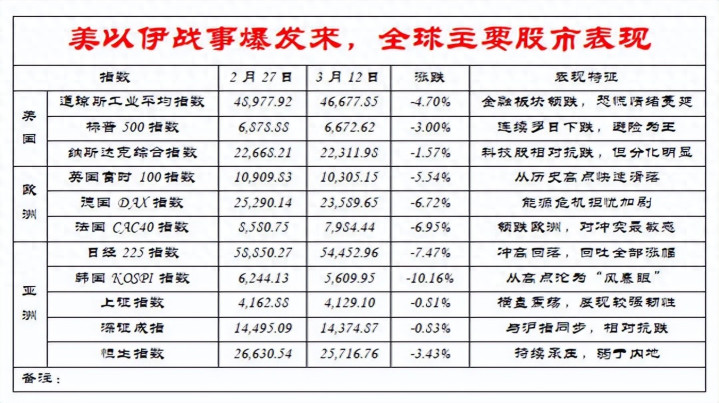 自2月28日战事全面爆发,短短两周,全球主要股市宛如上演了一部跌宕起伏的“冰与火之歌”:欧美市场深陷恐慌泥沼,东亚市场剧烈分化,中东本土市场更是在开盘首日便遭遇熔断的至暗时刻。以下,便是这场资本风云变幻的完整记录。